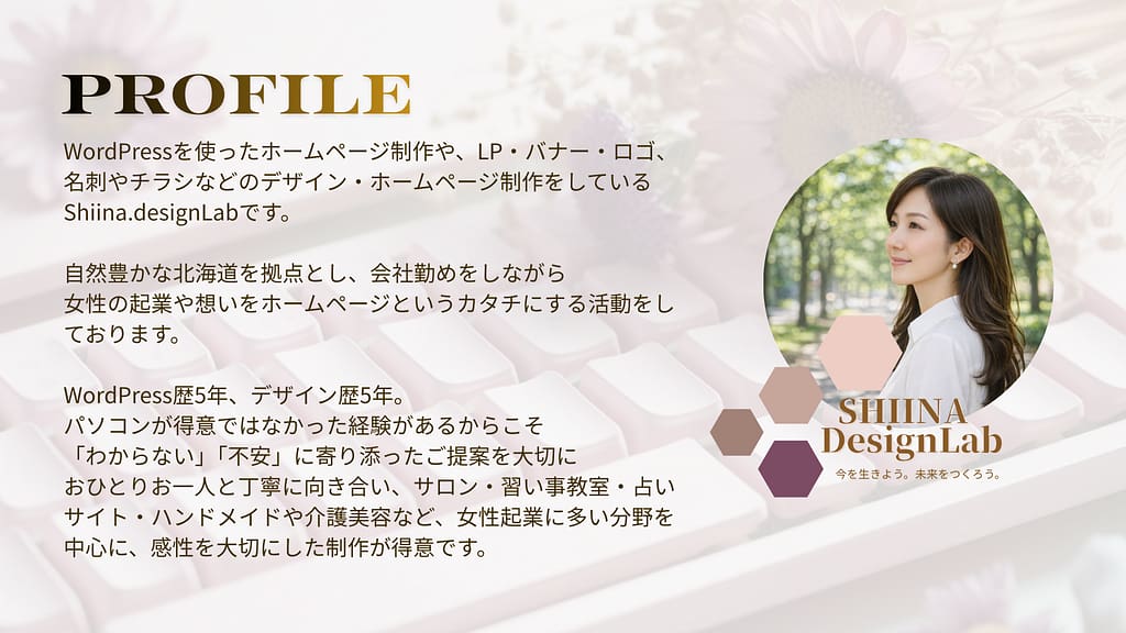 一歩踏み出した女性、または踏み出そうとしている50代の女性が、「頼んでよかった」「やってみてよかった」と感じられるよう、優しく、丁寧に、最後まで寄り添えたら嬉しいです♪